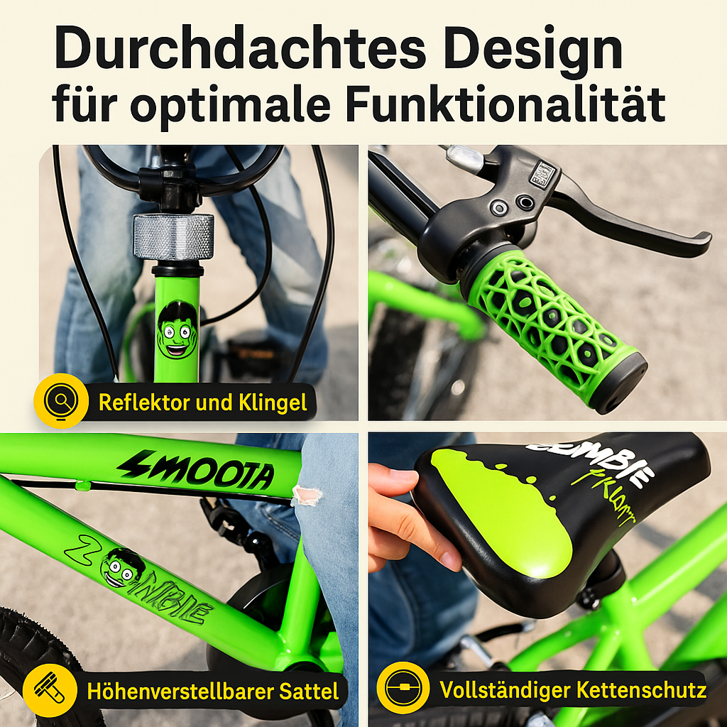 Mit Ihrem kleinen Liebling wächst auch das 16-Zoll-Kinderfahrrad Zombie mit. Das ermöglicht der von 57–66 cm höhenverstellbare Sitz. So sieht langanhaltender Fahrspaß aus!